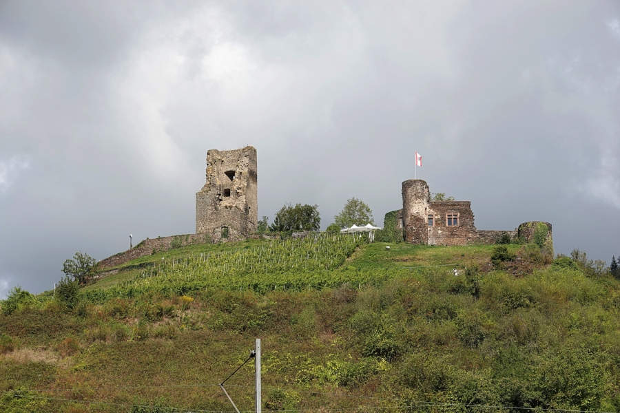 Einstige Reichsburg. In der östlichen Hälfte des Burgbereichs befindet sich noch das erhaltene Herrschaftshaus, bewehrt mit drei Rundtürmen, die den steilen Berghang zur Mosel absicherten. Der in seinem Kern romanische, fünfgeschossige Bergfried gehört zu den ältesten Teilen der Burg.