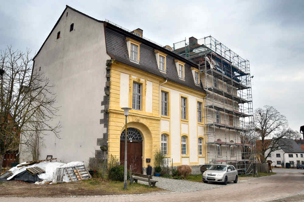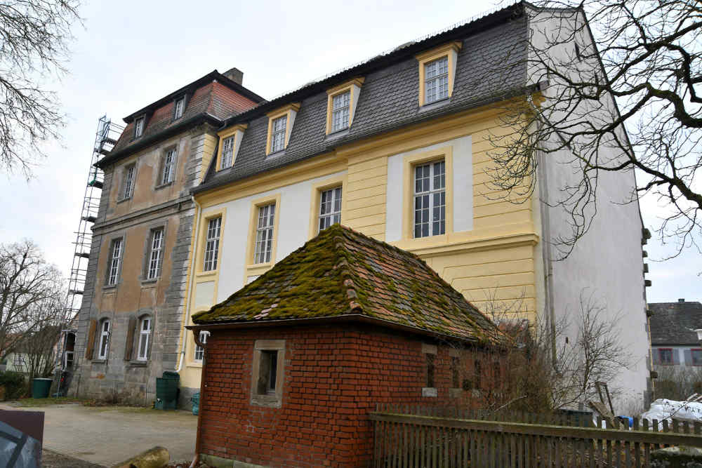 Sechsachsiger, zweigeschossiger Einflügelbau mit Mansarddach, dreigeschossiger Eckrisalit mit genuteten Pilastern