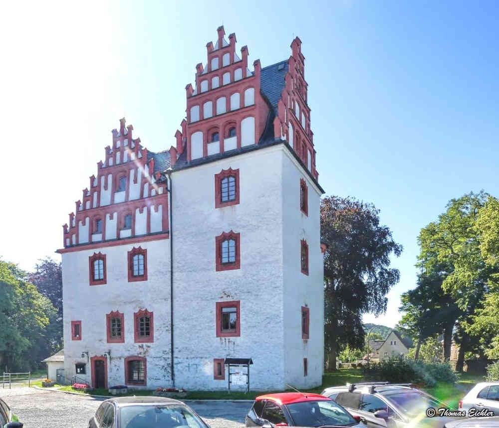 Ursprünglich hufeisenförmige Anlage, Staffelgiebel im Stil der sächsischen Spätgotik, rechteckiger Langbau mit Rundturm und vorgesetztem Viereckturm, Vorhangbogenfenster, Türrahmungen aus Sandstein aus dem 15. Jh., Ornament-Stuckdecken, Fechtboden