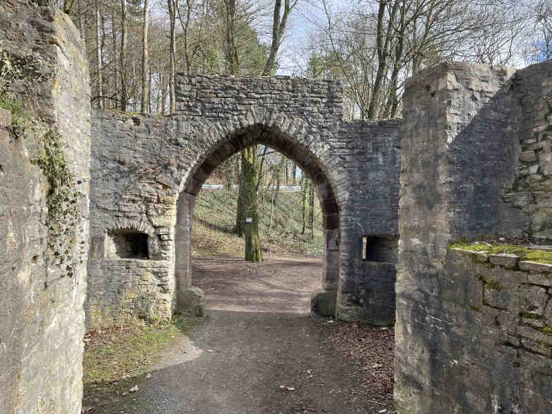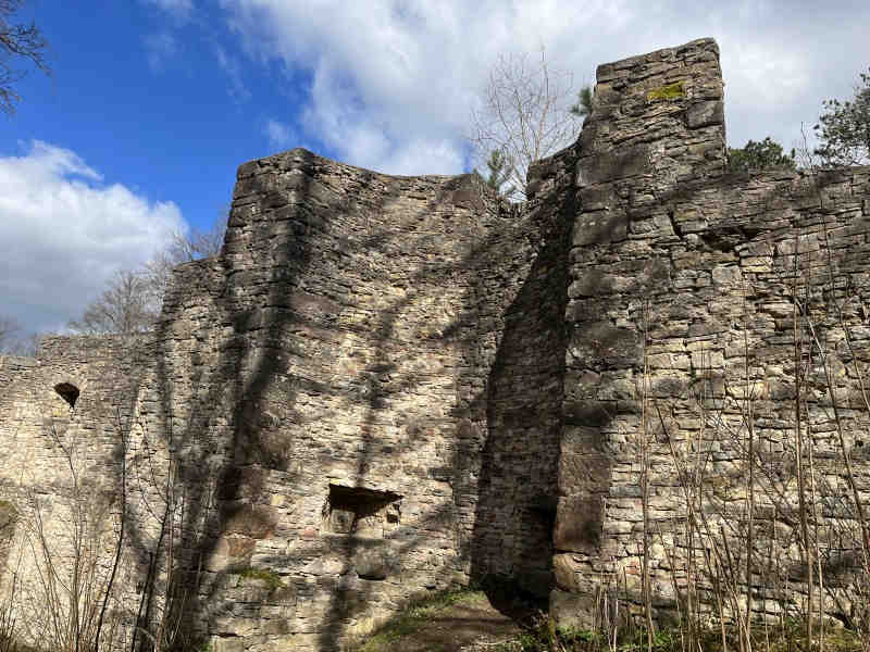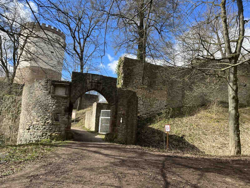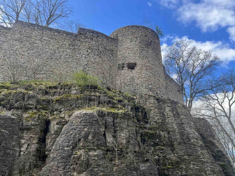 Erhalten: Reste der Vorburg, Bergfried, Wartturm, Reste des "Steinernen Hauses"