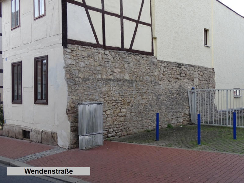 Vereinzelte Mauerreste der inneren Befestigung, einzig erhaltener Stadtmauerturm “Turm gegen St. Clawes” mit längerem Mauerzug in der Turmstraße sowie Torturm des Marientores zur Neustadt. Nahezu komplett erhaltener Stadtwall der äußeren Befestigung als Naherholungsgebiet. Bis auf das “Bollwerk an der Nodilienmühle (Bismarckhäuschen)” sind die Bollwerke abgebrochen und deren Standorte lediglich an den noch zahlreich vorhandenen Walldurchgängen erkennbar. Vom Stadtgraben erhalten ist nur der sog. Schwänchenteich. Hier sind besonders der auf Grund des Höhenunterschiedes zwischen Groner Tor und Geismartor erforderliche Damm mit Fragmenten eines Bollwerkes sowie die Schießscharten in der Wallmauer ersichtlich.