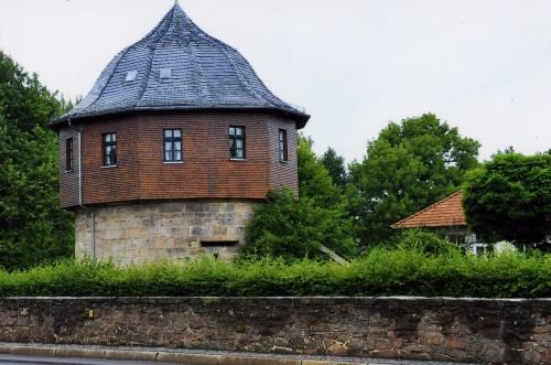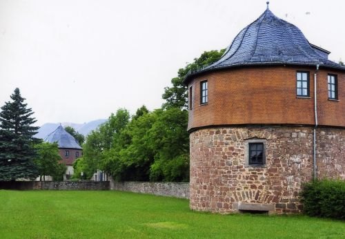 Ursprünglich Wasserburg über quadratischem Grundriss, vier runde Ecktürme mit verschindelten Fachwerkobergeschossen