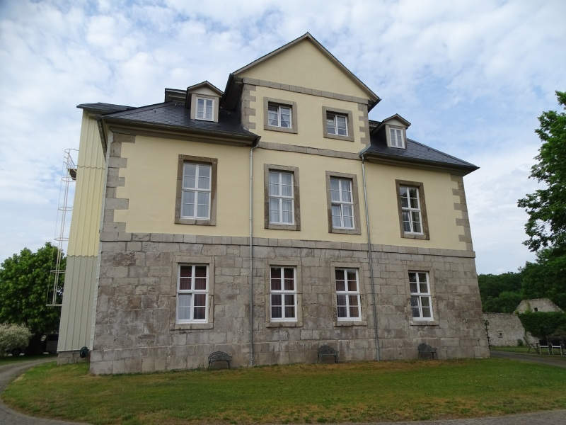 Zweigeschossiger Massivbau mit Mansarddach, fünfachsige Ostfassade mit Freitreppe
