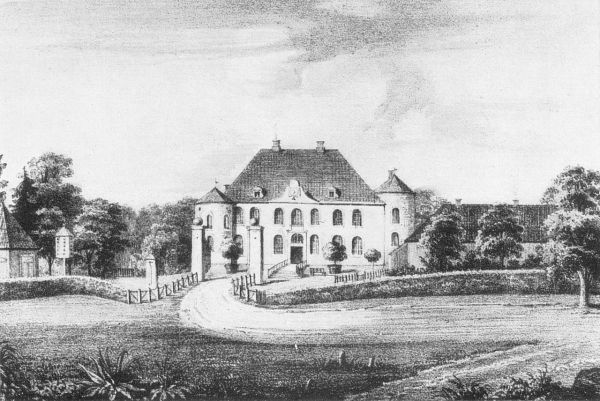 Ehemaliger Rittersitz, rechteckiges zweigeschossiges Gebäude mit hohem Walmdach und Rundtürmen an der SW- und NO-Seite