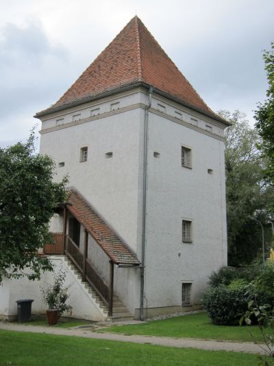 Dreigeschossiger Hauptbau mit zwei Ecktürmen, quadratischer Eingangsturm, zweigeschossiger Anbau mit offenem Arkadenhof, quadratischer und achteckiger Eckturm der ehemaligen Umfassungsmauer