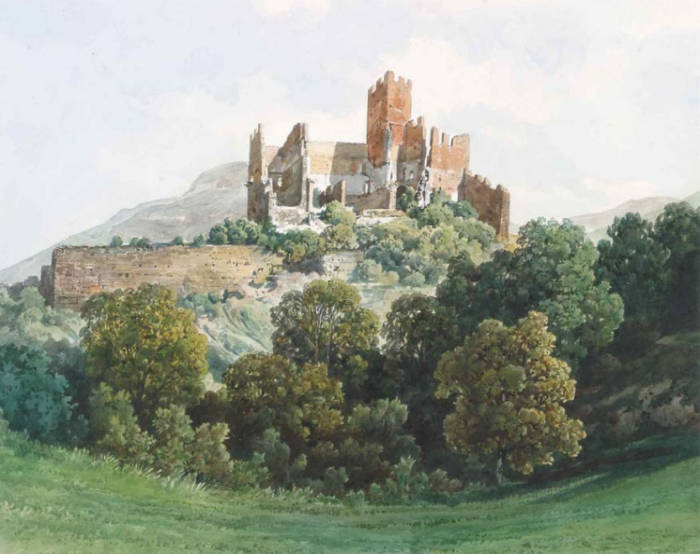 Ausgedehnte Anlage, zinnenbekrönte Kernburg, annähernd rechteckiger Hauptbau