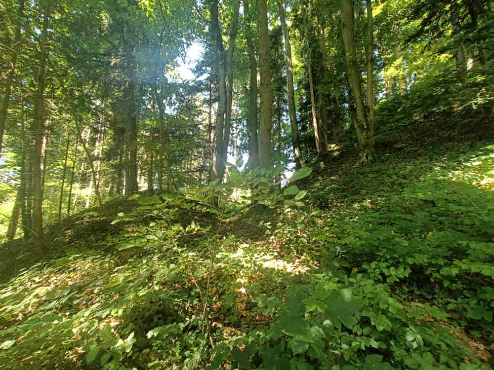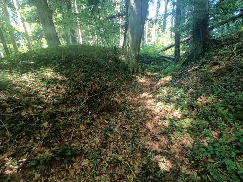 Verschwundene Höhenburg, Burgstall des hohen Mittelalters mit Wällen und Gräben