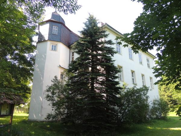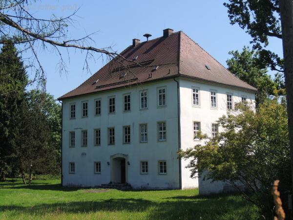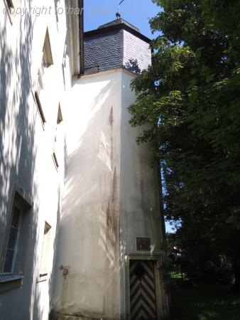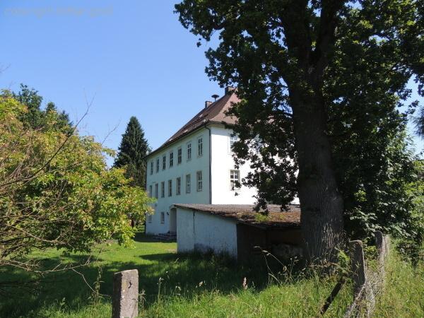 Fast quadratischer, dreigeschossiger Bau mit Walmdach, polygonaler Treppenturm an der Südseite