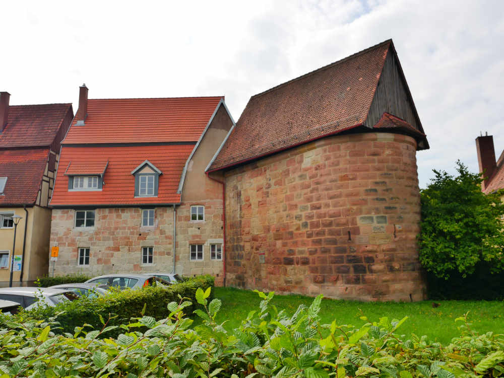 gestelzter, halbrunder und zweigeschossiger Sandsteinquaderbau mit aufgesetztem Steilsatteldach mit verbrettertem Giebel