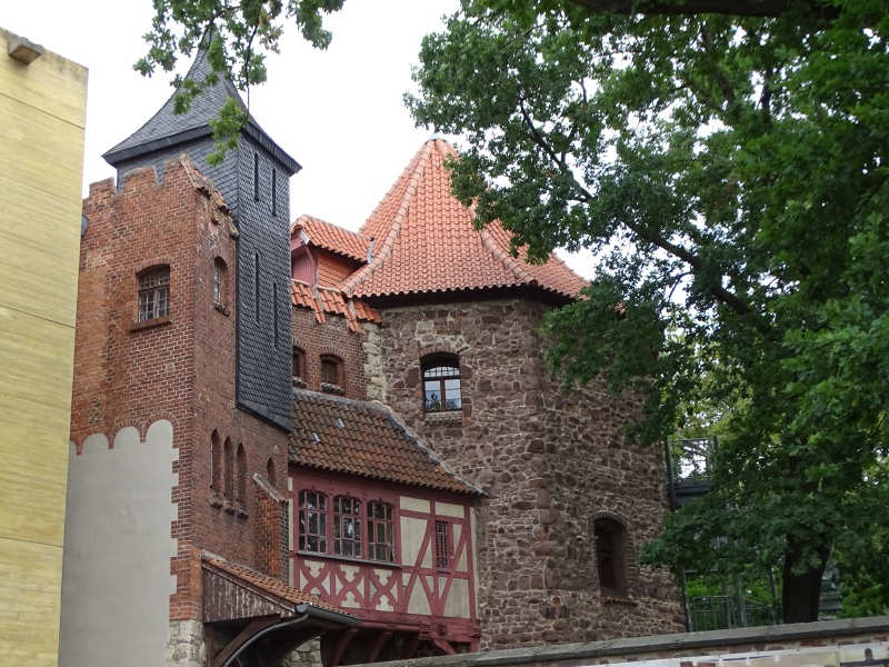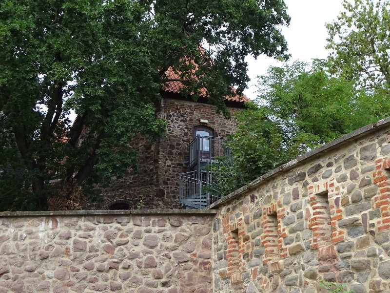 achteckiger dreigeschossiger Wehrturm, später romantisierender Anbau mit Treppenturm durch Künstlervereinigung (Lukasklause)