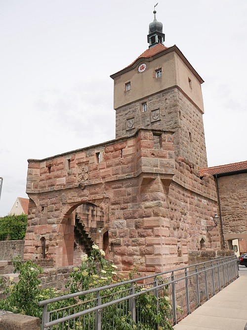 mehrgeschossiger Rechteckturm mit spitzbogiger Durchfahrt und Zeltdach mit Zwiebellaterne